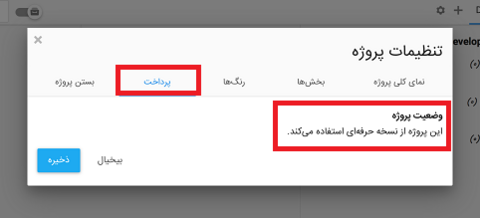 حالا در بخش" پرداخت" در "تنظیمات پروژه" میتونین ببینین که پروژه به طرح حرفهای ارتقاء پیدا کرده.
