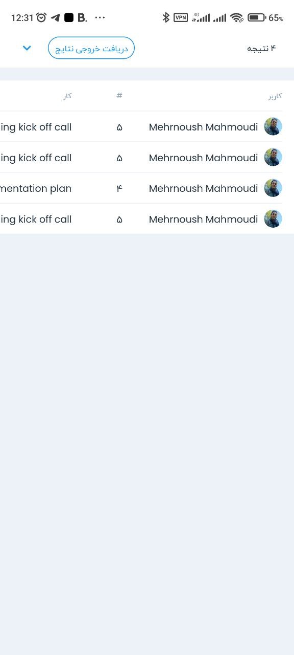 همانطور که مشاهده می‌کنید چهار نتیجه برای این جستجو وجود دارد که با کلیک کردن روی آن‌، نتایج تو صفحه جدیدی براتون باز می‌شود. هم می‌تونید با کلیک روی هر کدوم از کارها نسبت به ویرایش زمان کاری اون اقدام کرده و هم می‌تونید با انتخاب گزینه دریافت خروجی نتایج از نتیجه جستجو خروجی بگیرید.