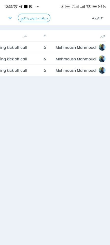 همانطور که مشاهده می‌کنید سه نتیجه برای این جستجو وجود دارد که با کلیک کردن روی آن‌، نتایج تو صفحه جدیدی براتون باز می‌شود. هم می‌تونید با کلیک روی هر کدوم از کارها نسبت به ویرایش زمان کاری اون اقدام کرده و هم می‌تونید با انتخاب گزینه دریافت خروجی نتایج از نتیجه جستجو خروجی بگیرید.