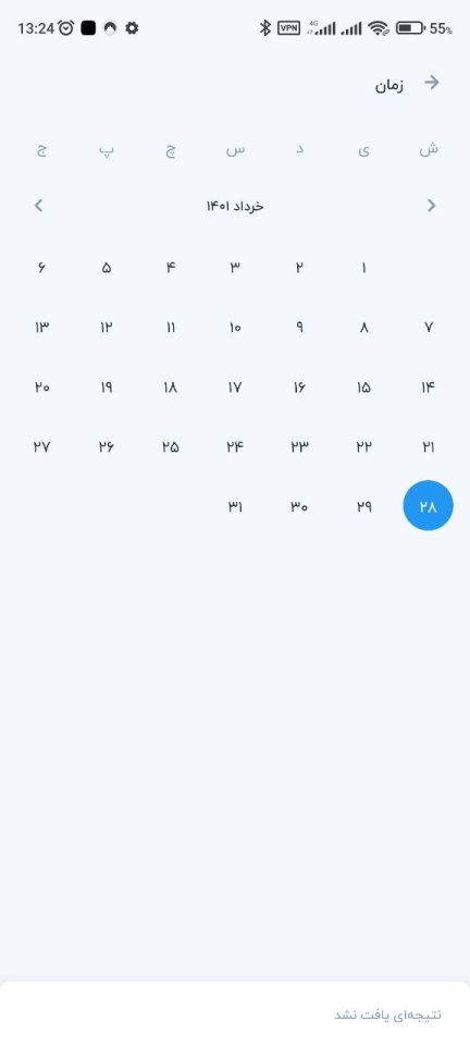 همانطور که مشاهده می‌کنید نتیجه‌ای برای این جستجو وجود ندارد. یعنی در تاریخ ۲۸ خرداد هیچ زمان کاری ثبت نشده است.