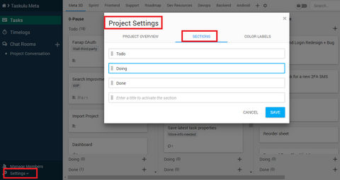 To edit sections, click on "Settings" and open "Project Settings" . Find "Sections" and start editing . Don't forget to "Save" before you close the window.